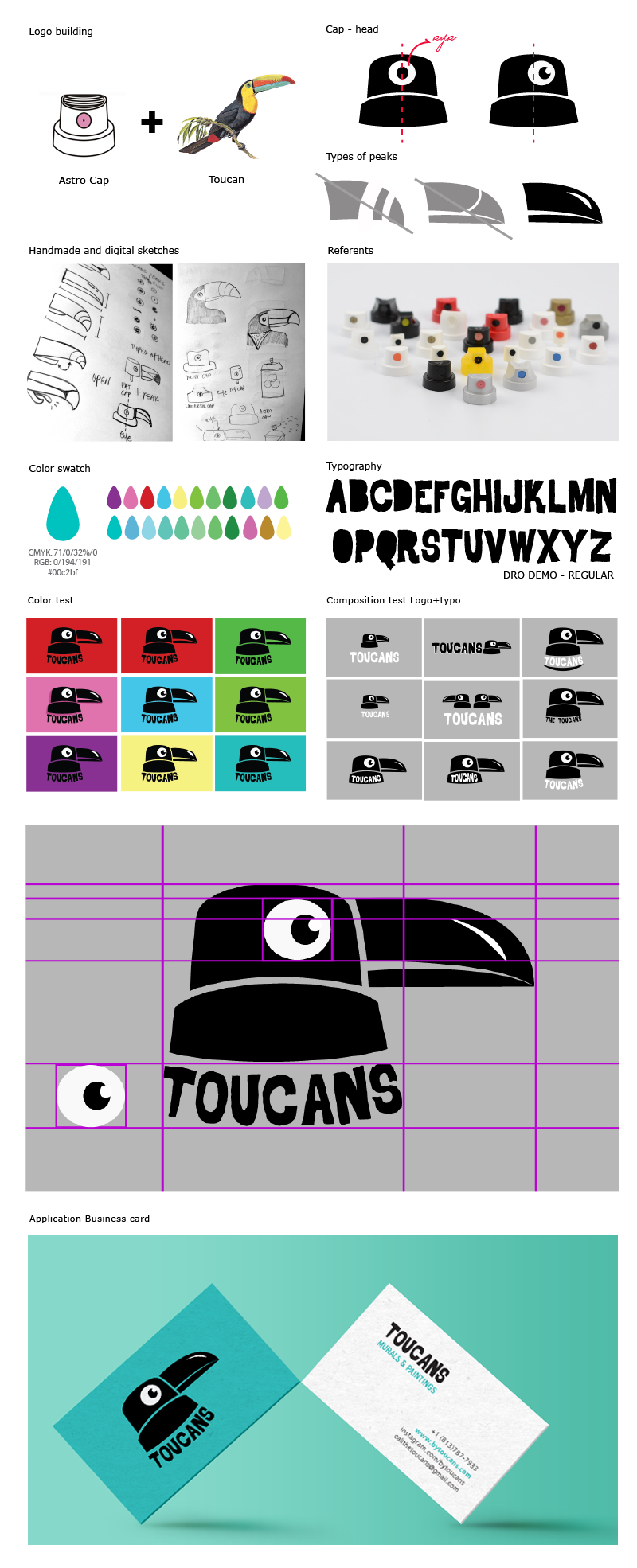 Create the Brand Identity, that helps to have an artistic point of view of those people of the community that are not involved in this activity. The name of the brand is Toucans, because it's a game of sense meaning two cans and the toucan bird. The main idea is color, and the toucan is famous for it's colorful peak.